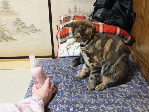湿布薬のメントールの匂いは 目がしぱしぱになっても嗅ぎに行くくせに、 Ru-chi愛用のボディーローションの香り(バラ)は大嫌い。 明らかに逃げ腰です。