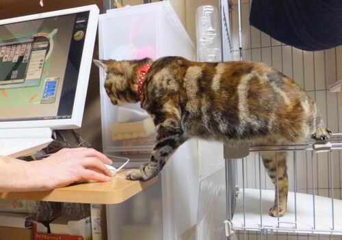 Ka-chiがパソコンで遊んでいると、 虎娘がやってまいりました。 足場を探しながら移動して、 パソコンデスクに進入。 マウス台を占拠して、 追い出されたKa-chiがどきなさい!言っても どこ吹く風。 この俺様ならぬ女王様っぷりが 「姫様」の称号の所以です(苦…