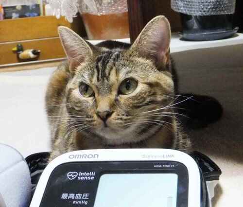 飽きもせずKa-chiの計測タイムにおつきあい。 血圧どうでしたか?というお顔。 Ka-chi「(虎娘に)血圧計る?」 A-chi 「どうやって計るつもり?」 Ka-chi「腹に巻けば・・・」 ダメです、Ka-chi。