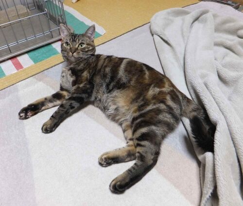 ここ連日の寒さは 立派な毛皮持ちの虎娘にも辛いようです。 じっとしている時は ホットカーペットにべったりです。