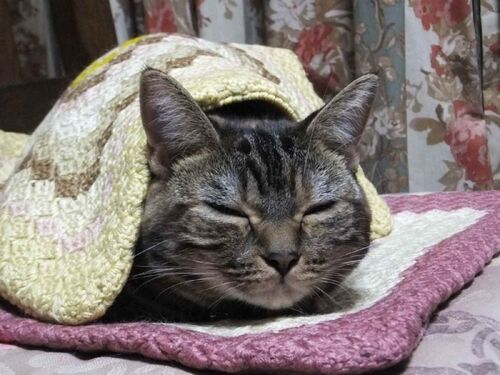 Ka-chi手編みのマット。 イタズラで掛けてみたのですが 案外気に入ったようです。 気温が大分下がってまいりました。 皆様も暖かい格好でお過ごし下さいませ。