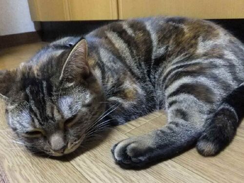 食事の準備中は換気扇を使用したりするため 暖房がさっぱり効かず寒い台所。 遂にKa-chiが音を上げて、 数年前に台所用のホットカーペットを流しの足元に導入したのですが、 今シーズン、ヒトドモが離れると 必ずととと、とやって来てどかーんと占拠する虎娘…