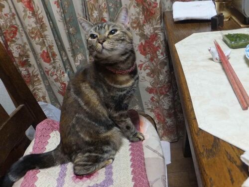 夕食時、 Ka-chiが席を離れたのを確認して席に飛び乗り… 食べられそうなものはないかと物色し始め… Ka-chiに見つかり強制退場。 ここのとこ毎晩こんな感じです。はー。
