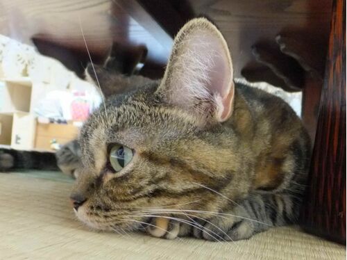 あまりの湿気の高さに 折角雲が出て陽が陰っても動くと汗が噴き出し ちっとも楽になりません(疲)。 涼しい所を探してウロウロしていた虎娘も 遂にへばってしまいました。 ああ…魂抜けてるわ…(汗)。