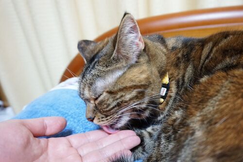 毛づくろいに熱中している時にそっと手を差し込むと ついでか勢いか面倒なのか(苦笑)一緒に舐めてくれます。ついつい。