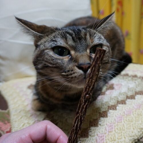 虎娘、またたびの枝ですよー。 ・・・(汗)。 まあ、またたびの実でも反応するものとしないものがあるので 枝はダメ、ということではないと思うのですけどね。