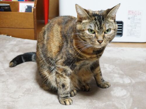 スマホを新しくしたので、虎娘で撮影練習。 嫌というよりは新しいものに警戒気味? とりあえず、まだ撮影されているとは気づいていないようです。