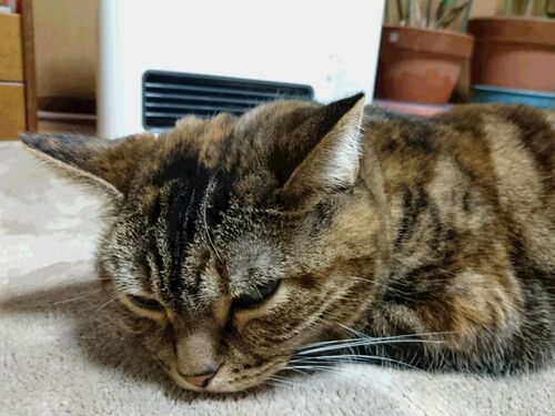 ようやく冬らしい寒さがやってくるようになり・・・ 気づくと虎娘がストーブ前でぬくぬくを満喫しています。