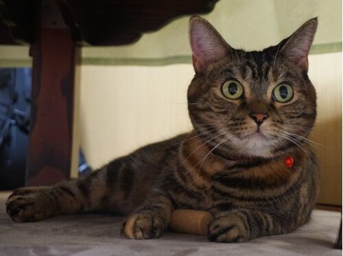 既製品の猫用ボール(鈴入りとか、フェルトとか、麻とか)には さっぱり興味を示しませんが、 アルミホイルを丸めたものとか、目薬の空容器とか コルクの栓なんかでは喜んで遊んでいます。 今夜はコルク栓で一緒にサッカーしてご満悦です。 出来ればあらぬ方に…