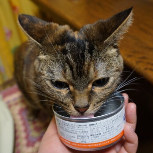 療養食の缶詰(ヒルズのk/d)を小分けにしていたら 寝ていたはずの虎娘が飛んできたので ちょこっとだけ味見ね。カリカリ量ってる時は来なかったのにねえ(苦笑)。 とりあえず気に入ってくれて良かったです(投薬的に)。