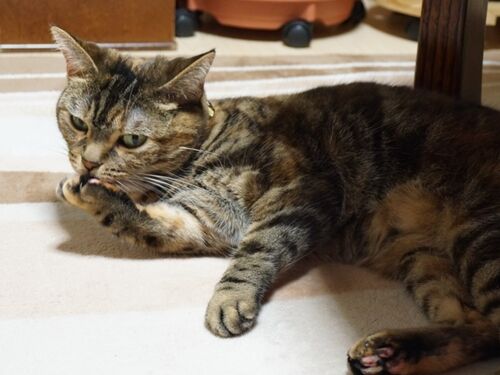 またたびおもちゃを満喫したあと、 遊んだ手をじっくり舐めて余韻を楽しむ虎娘。 目つきはアレですが(苦笑)。