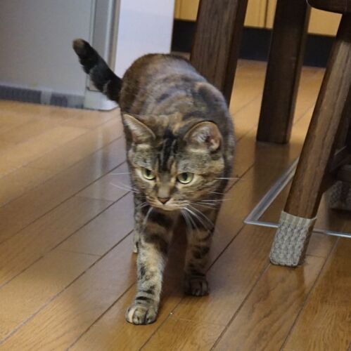 二階で熟睡していたはずの虎娘ですが…下でマンマの支度をしていたら 速攻下りてきました。さすが…(苦笑)。