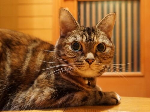 今夜もエアコンを嫌って部屋を出てしまった虎娘、 どこに行ったのかと思ったら、珍しく玄関でくつろいでいました。 多分先にヒトドモの靴を入念にチェックしていたものと思われます(汗)。