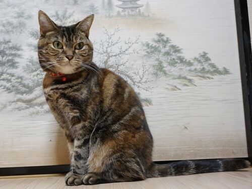 台所に入りたくて扉の前で張り込む虎娘。 …自分で開けられるくせに、そこは待てるのね(汗)。