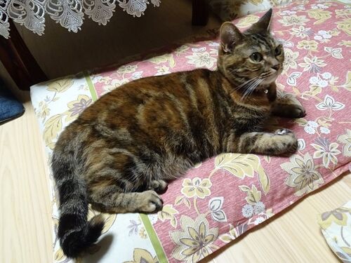 遂に居間のホットカーペットを片付けました。 (流石にヒトドモ暑苦しさに耐えられず) 虎娘、どうかなーと思いましたが 座布団があれば問題無いようです。 つまりヒトドモと席取りゲームするということね…。